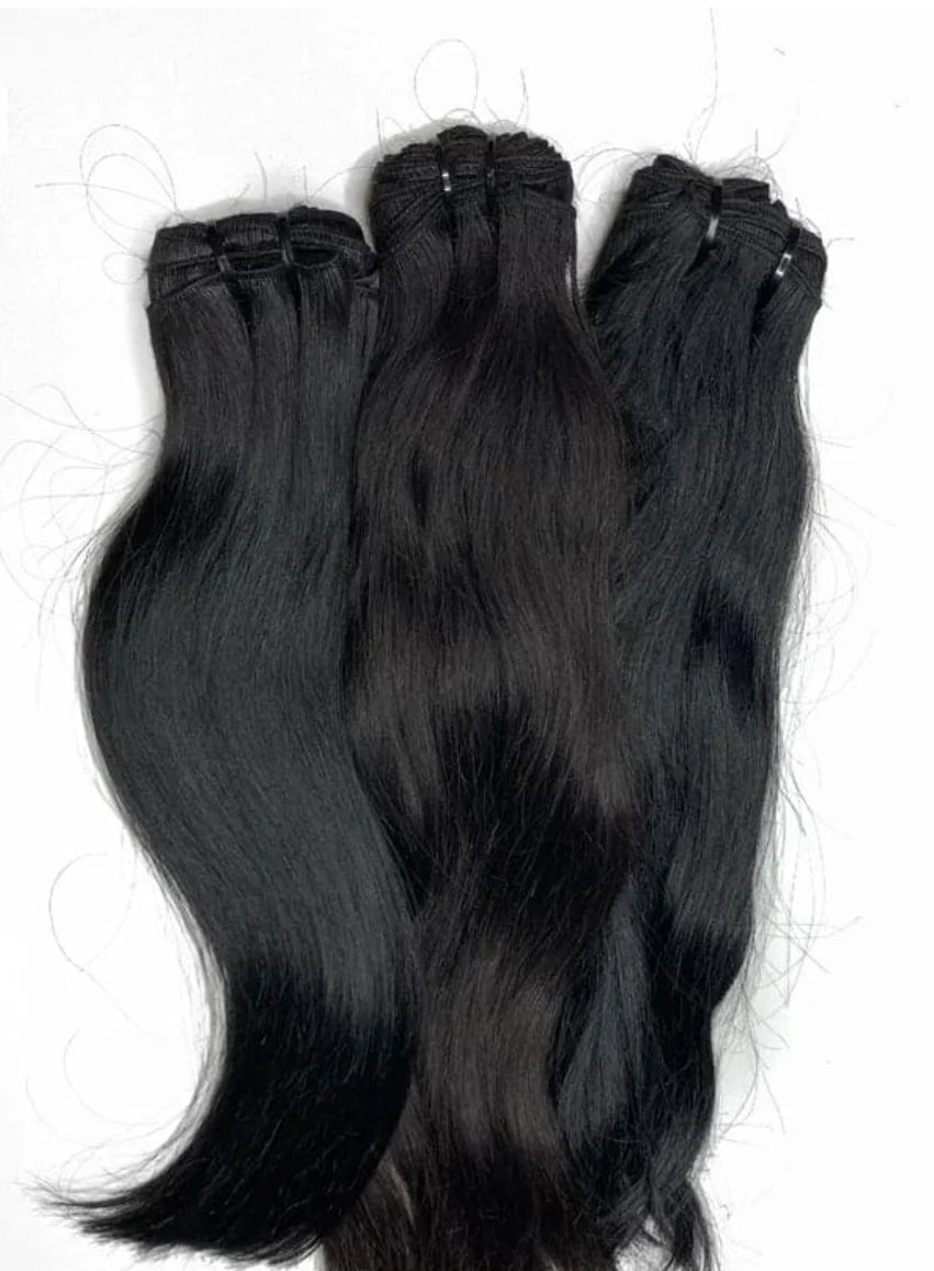 Our Raw Indian Natural Straight Hair Extensions are ethically Sourced from South Indian Temples and can have a slight wave patterns as it is natural and unprocessed.It is often softer and finer than Caucasian hair with a higher density that gives it a fuller look that blends seamless with natural or relaxed hair. If you are looking for perfect bone straight you may have to flat iron but Will revert back to a natural state after wash.